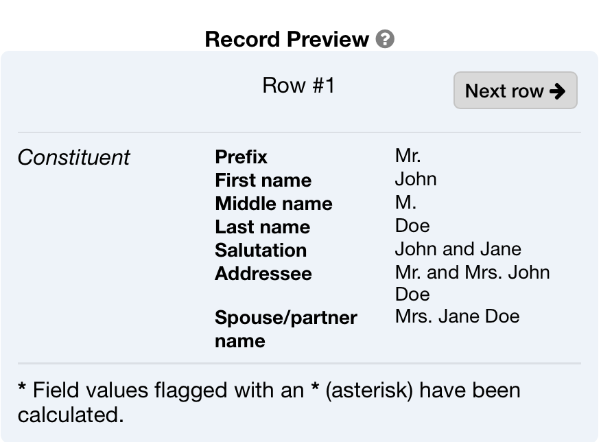 NOTE ABOUT CALCULATED ADDRESSEE/SALUTATION DATA: In all cases when mapping constituent data, if the import record will create a new constituent the Record Preview displays the calculated addressee and salutation fields. If the import record will update an existing constituent record, the calculated addressee and salutation will not display in the Record Preview.