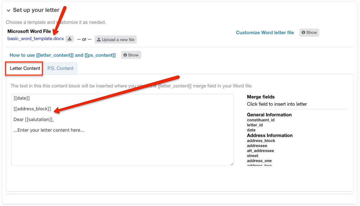This template choice requires that you create a Word document that contains either your letter content and your LGL merge fields or the [[letter_content]] merge field.