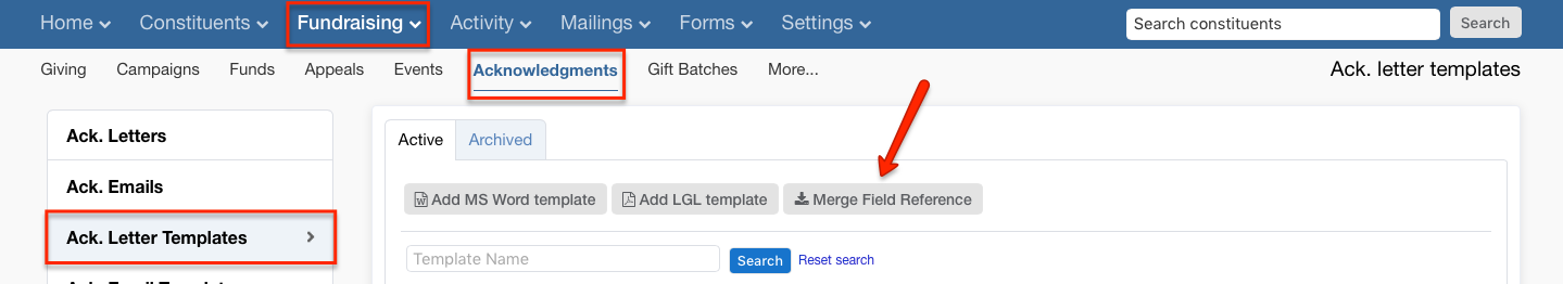 - Go to Fundraising > Acknowledgments and click on Ack. Letter Templates.
