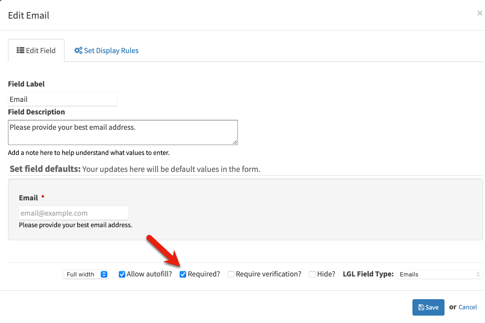 The first step in building your form is to require that the email address field be completed. The email address is important because you need it in order to be able to send a newsletter, and you also need it to communicate with the donor about their donation, if you are building a donation form.