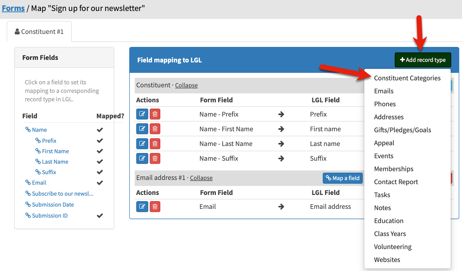 Now you can set up the field mappings for these required fields from the LGL Forms Integration tab, where you can add settings for the form and map all of the form fields to direct data into the correct fields in your LGL database. For both Mailchimp and Constant Contact, whether a person is subscribed is indicated by a constituent category that is assigned to their record. So once you are in the integration/mapping area, click Add record type and choose Constituent Categories, as shown here: