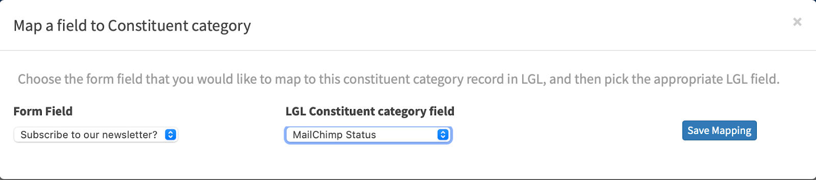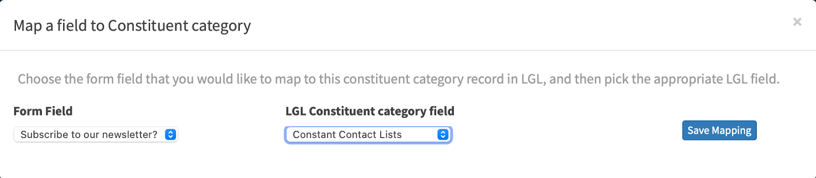 This action creates a constituent category section in the form's mapping that you will use to subscribe the donor to Mailchimp or Constant Contact.