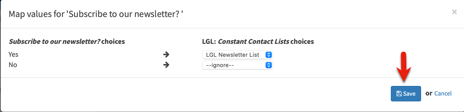 Map the "Yes" value to the corresponding Constant Contact List you would like to subscribe the constituents to, and set the "No" value to "ignore".