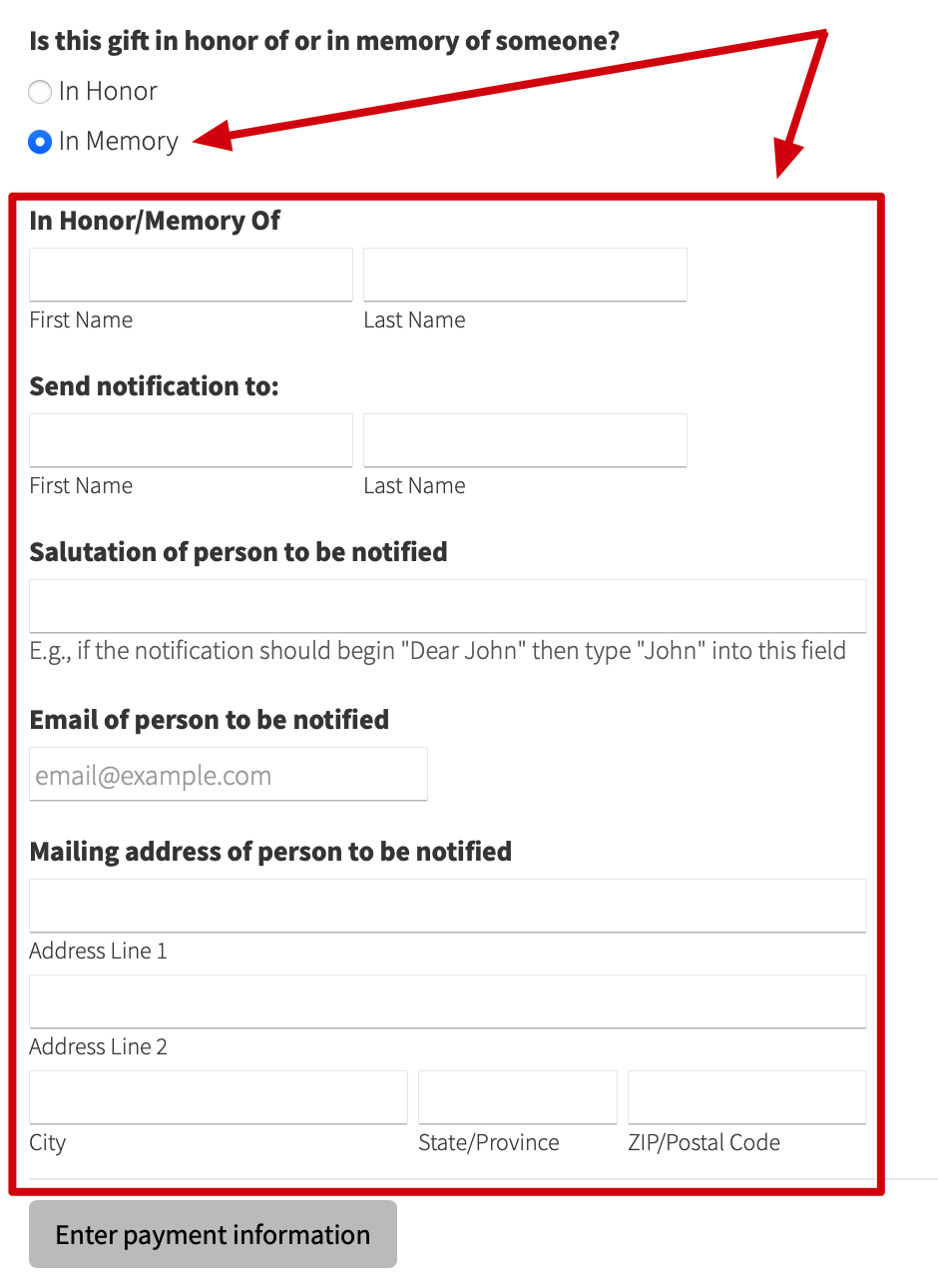 | Radio Buttons | Is this gift in honor or in memory of someone? | In Honor, In Memory |