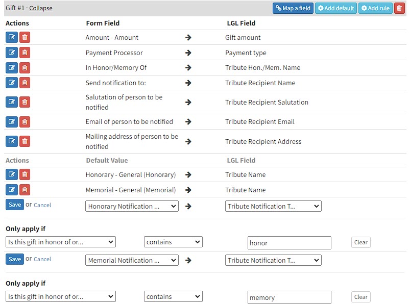 - Next add default values to set the tribute type as honorary or memorial based on the user’s selection in the form. To add the defaults, click the “Add default” button in the “Gift #1” mapping. Set the default for the “Tribute Name” field to “Honorary - General (Honorary)”. Set the rule to apply when the form field “Is this gift in honor or memory of someone” contains “Honor.” Save the new default rule.