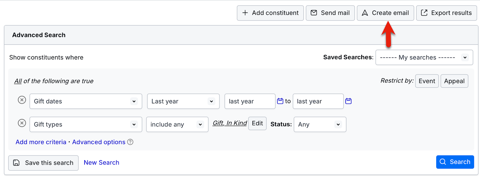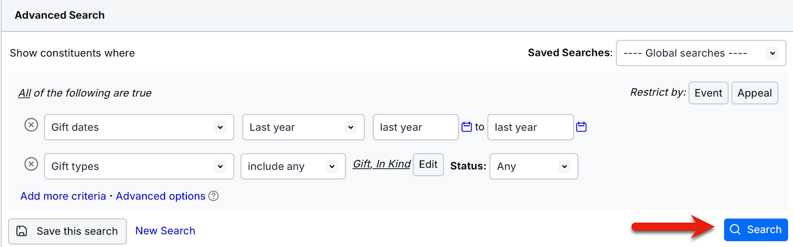 Begin by searching for “last year’s donors” in the Advanced Search area within the Constituents tab.* This search will pull in anyone who gave a gift "last year" with a gift type of “Gift” or “In Kind”.
