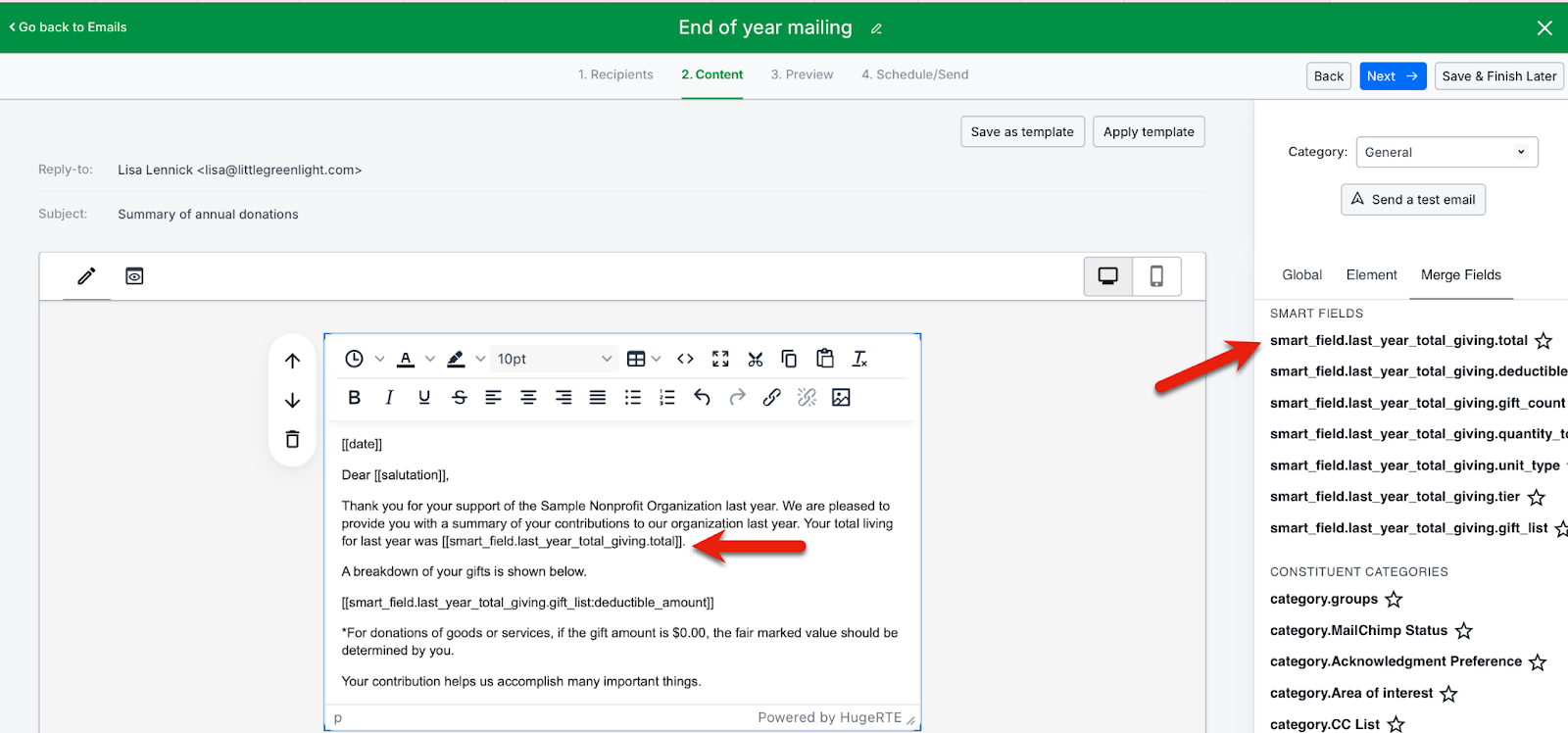 The key part of the letter is the merge tag of [[gifts.YYYY.list]]*, which pulls a full itemization of the gifts from the giving year—with dates, deductible amounts, and notes—into a list in the email.