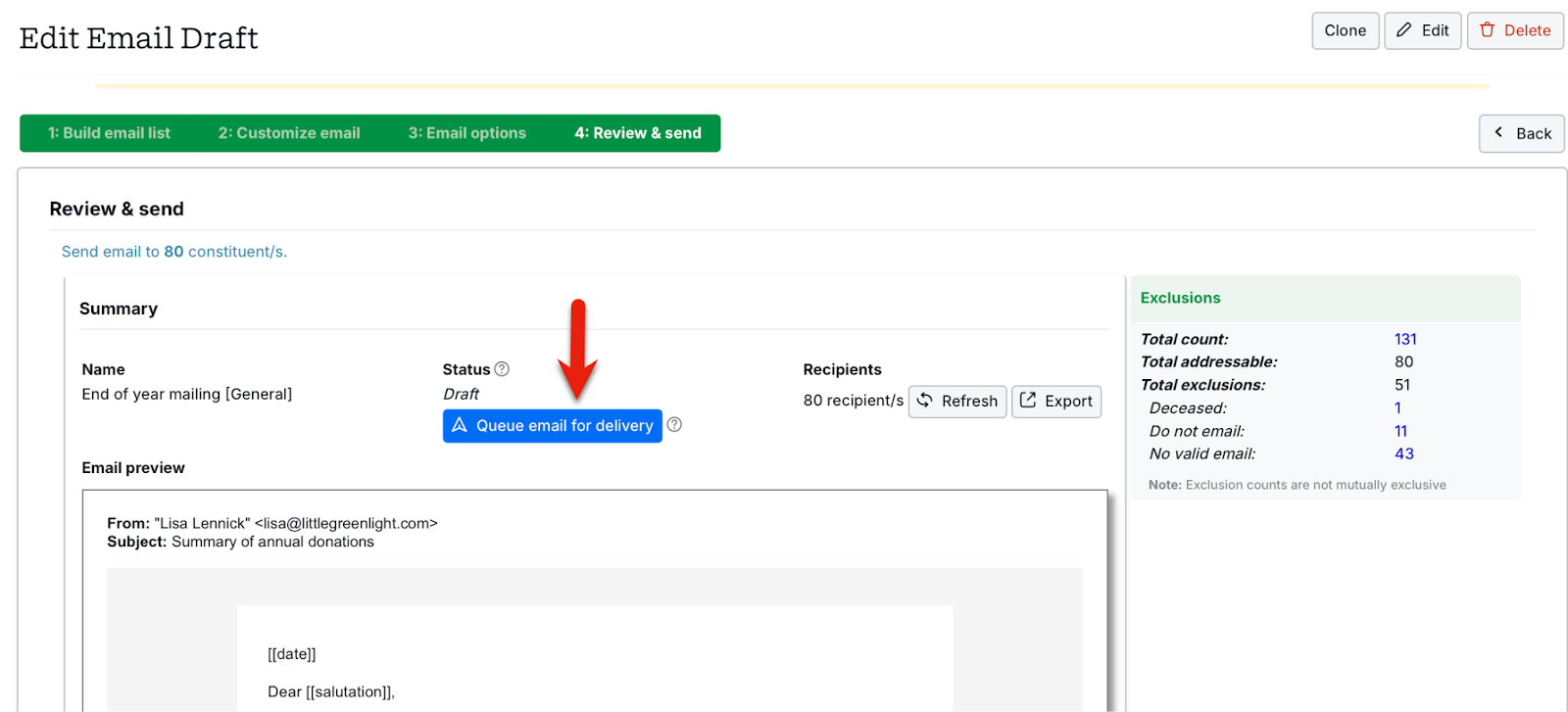 - Preview the individual emails that will go out and, when ready, queue the email for sending