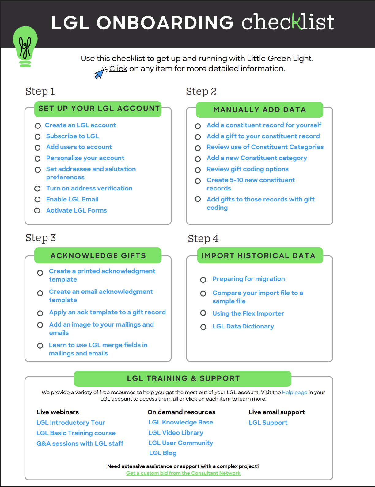 Once you have a Little Green Light account, you can proceed with the following onboarding steps. Download our Onboarding Checklist to keep track of your progress:
