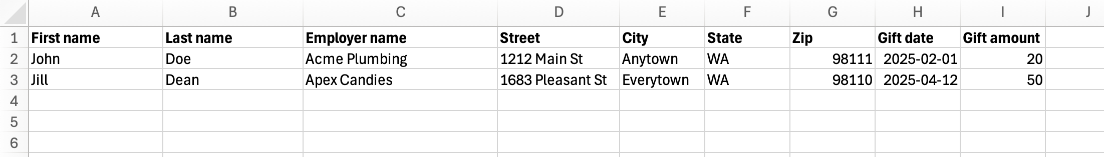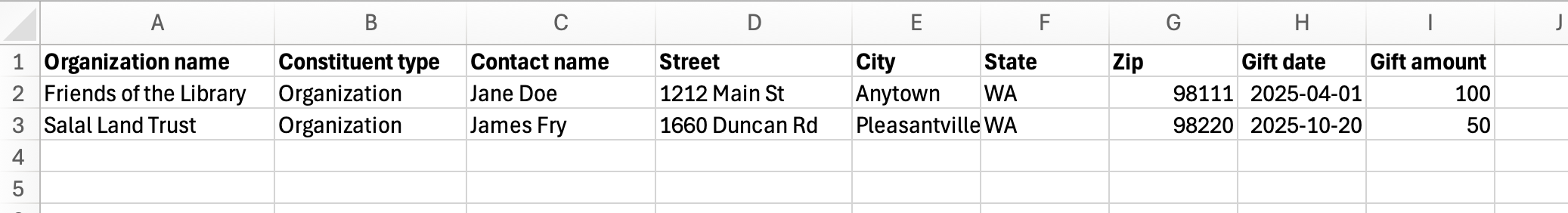 Every row in your spreadsheet must contain enough information to create or update a constituent in LGL. The minimum information can be First Name, Last Name, or Organization Name. Or it can be External Constituent ID or LGL Constituent ID.