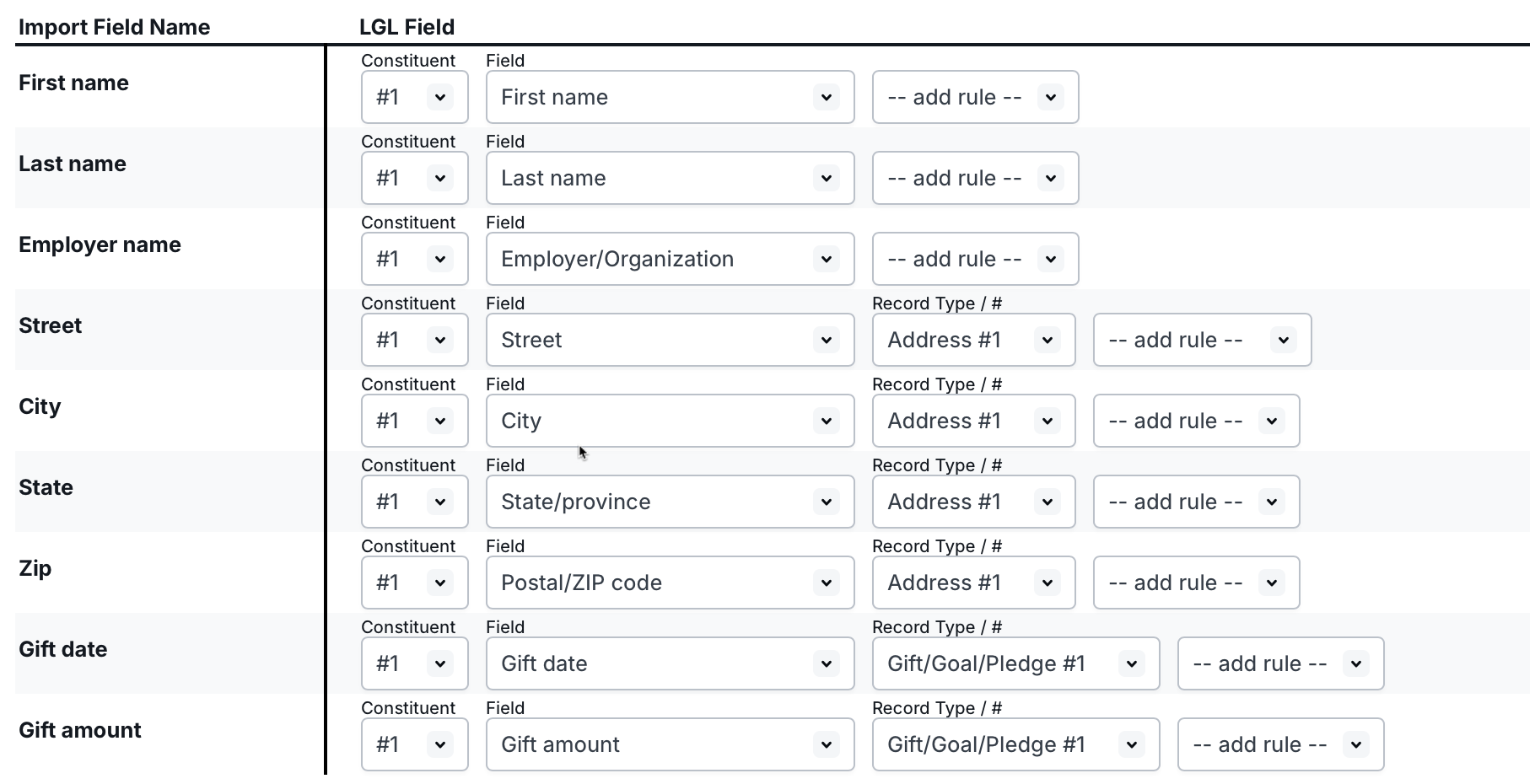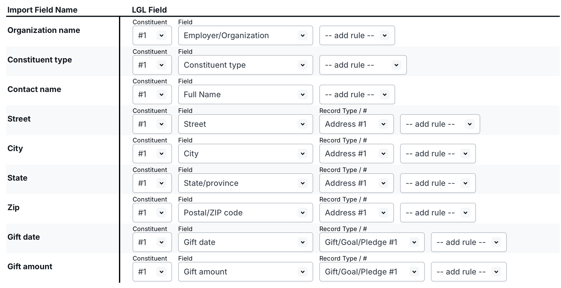 - When re-importing, ensure that you set up a mapping for LGL Constituent ID so that the bulk change you are making will occur in the correct constituent record/s