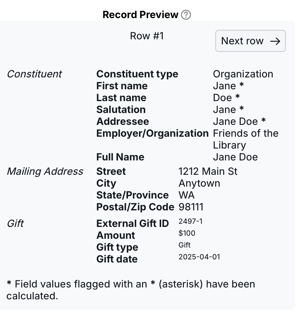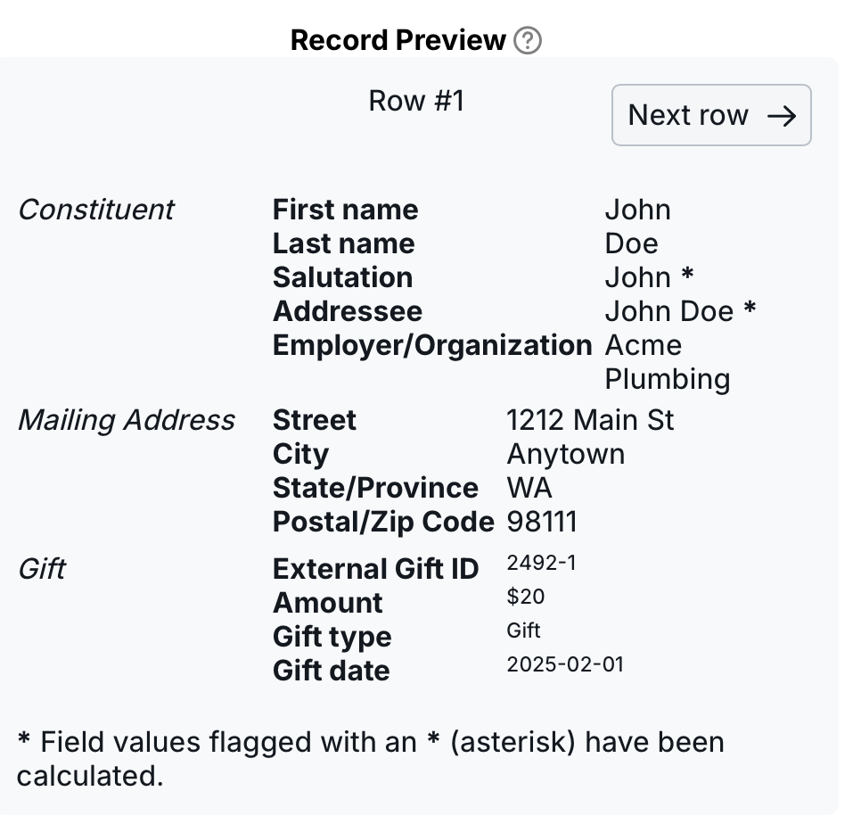 NOTE ABOUT CALCULATED ADDRESSEE/SALUTATION DATA: In all cases when mapping constituent data, if the import record will create a new constituent the Record Preview displays the calculated addressee and salutation fields. If the import record will update an existing constituent record, the calculated addressee and salutation will not display in the Record Preview.