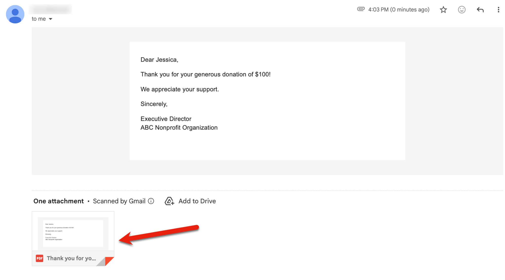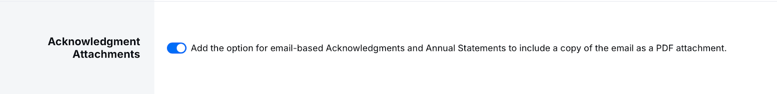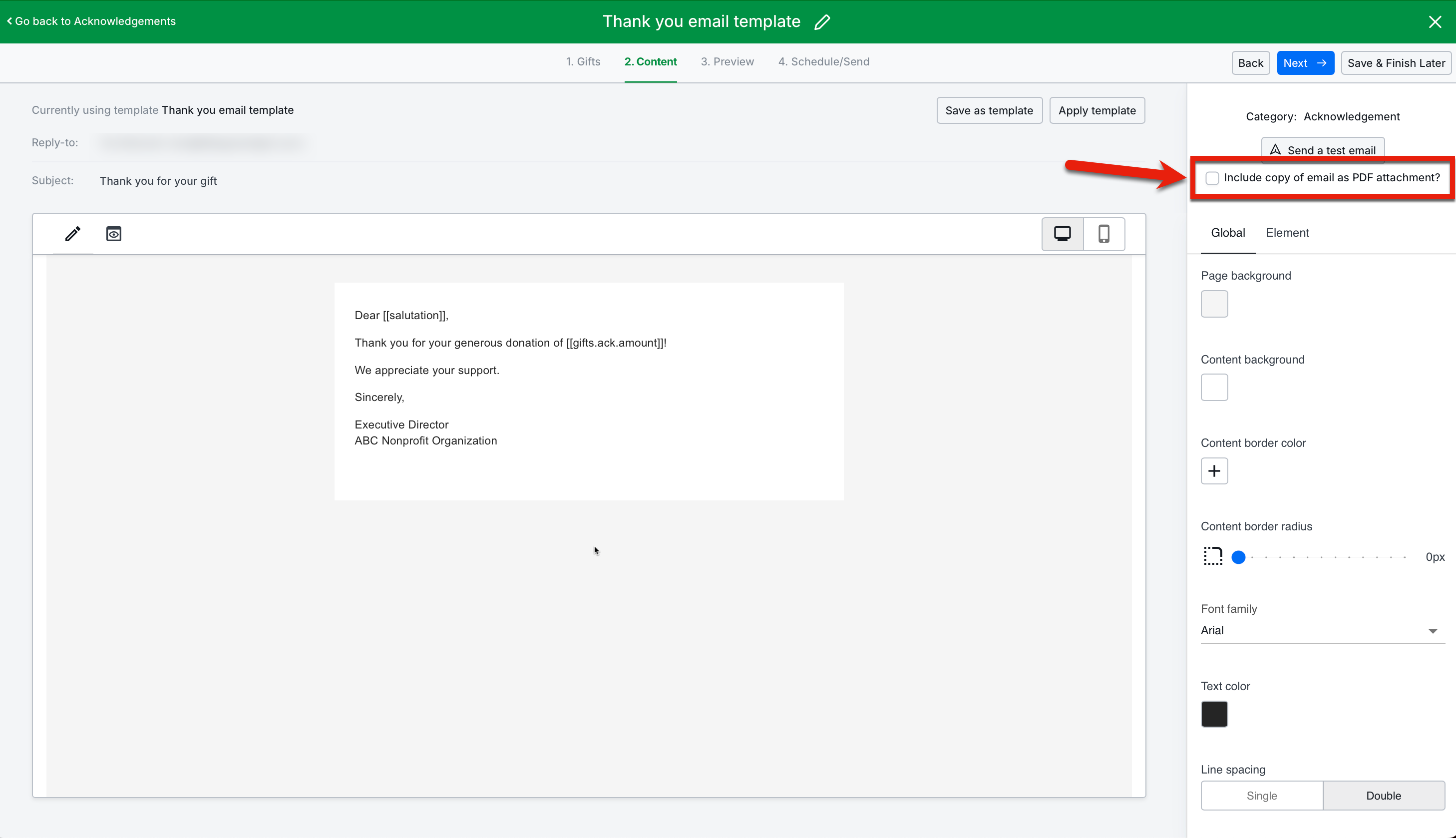 If you would like to attach a PDF version of the acknowledgment email to the acknowledgment email itself, you will need to first turn on this setting by going to Settings > Subscription settings > Gift settings and scrolling down the page to Acknowledgment Attachments: