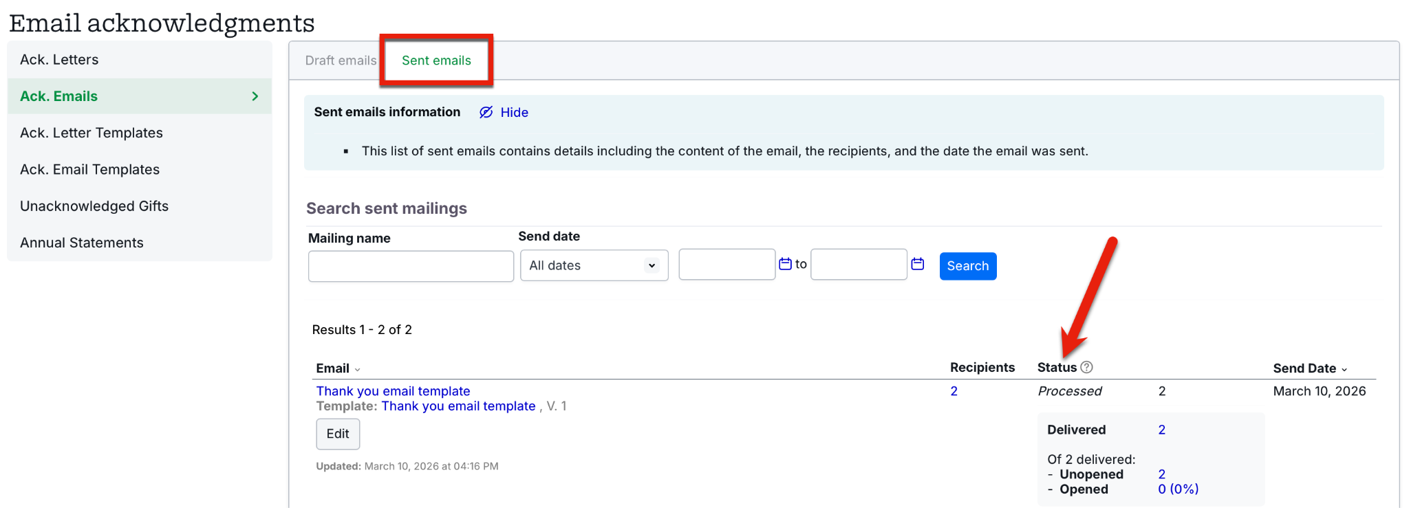 Once the email has been sent, it will be marked as processed. You can confirm this by going to Fundraising > Acknowledgments > Ack. Emails and viewing your email acknowledgment's status in the Sent emails tab: