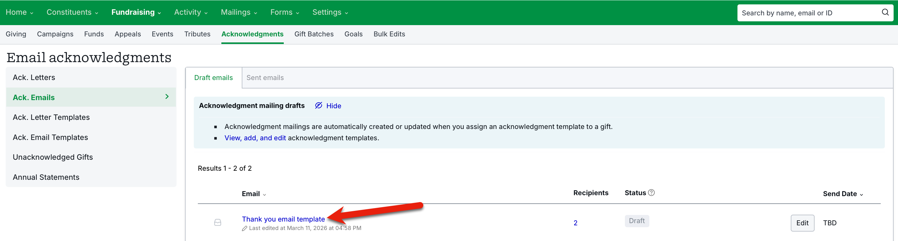 To send a test email, go to Mailings > Acknowledgments > Ack. Emails, and click on the email acknowledgment draft: