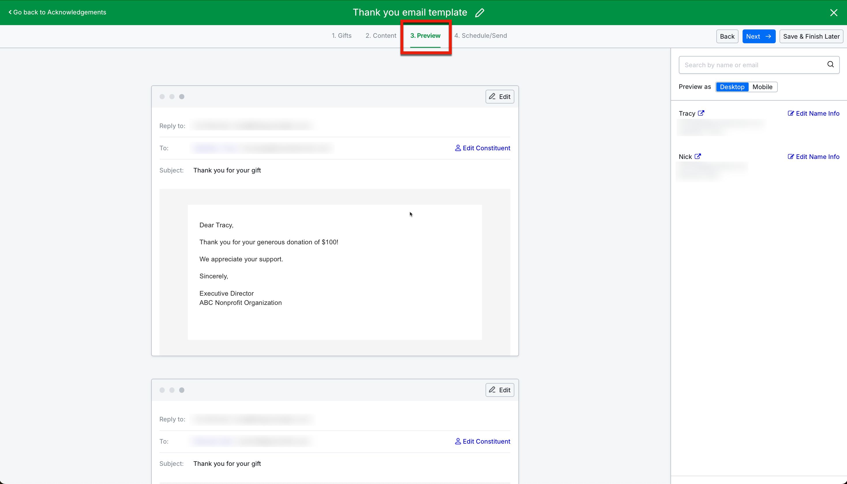 Step 3 in the email builder gives you the option to preview your acknowledgment emails, and offers other options as well. Here you can see how your emails look before you send them.