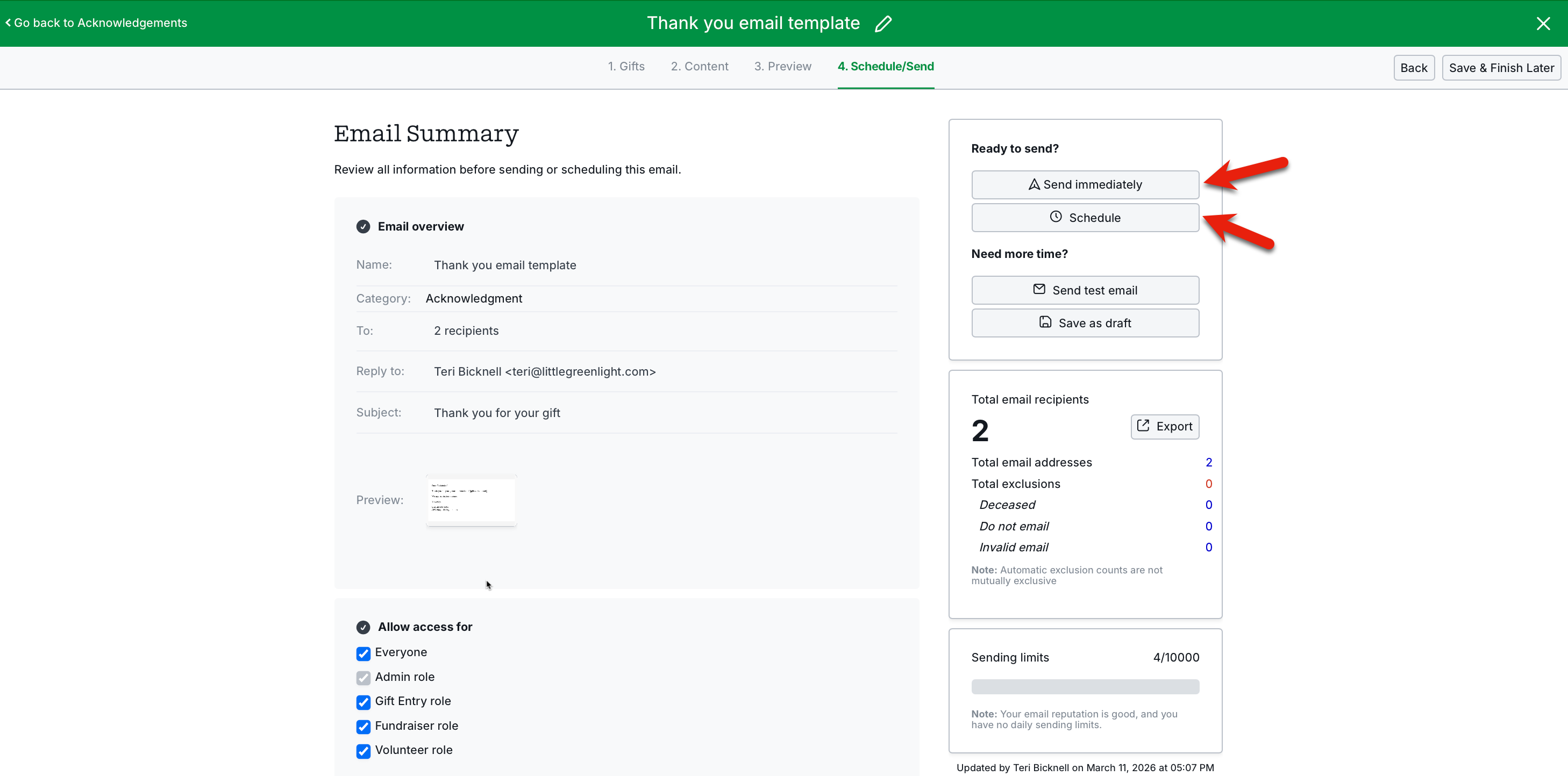 When your email acknowledgments are ready to send, navigate to the 4. Schedule/Send step of the email builder. Here you have options to send the email immediately or schedule it for up to 30 days in advance: