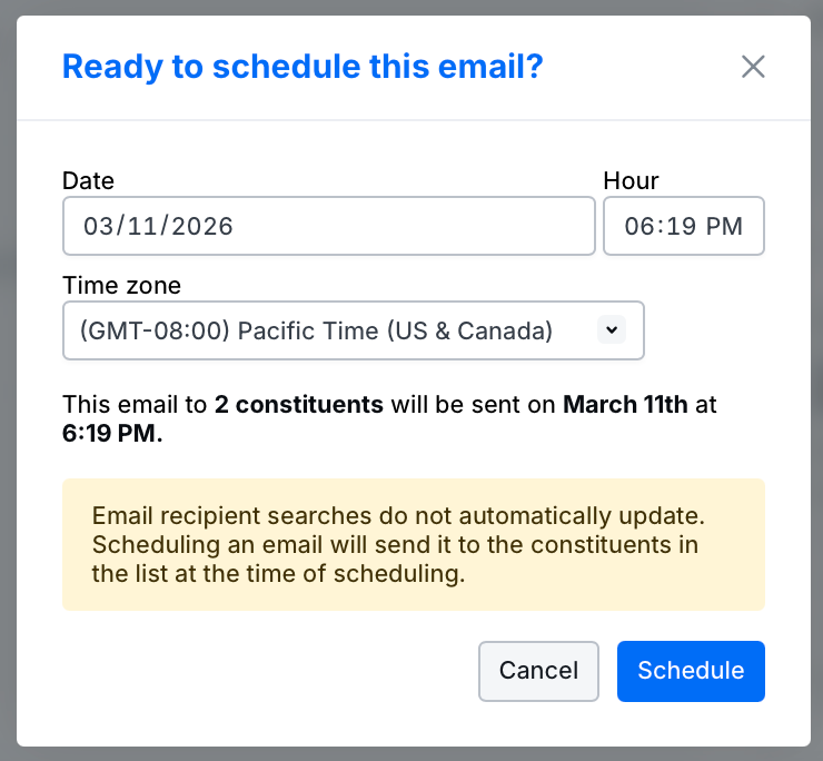 To schedule your email acknowledgment to be sent sometime within the next 30 days, click the Schedule button. Then make your selections in the popup that opens and click the Schedule button: