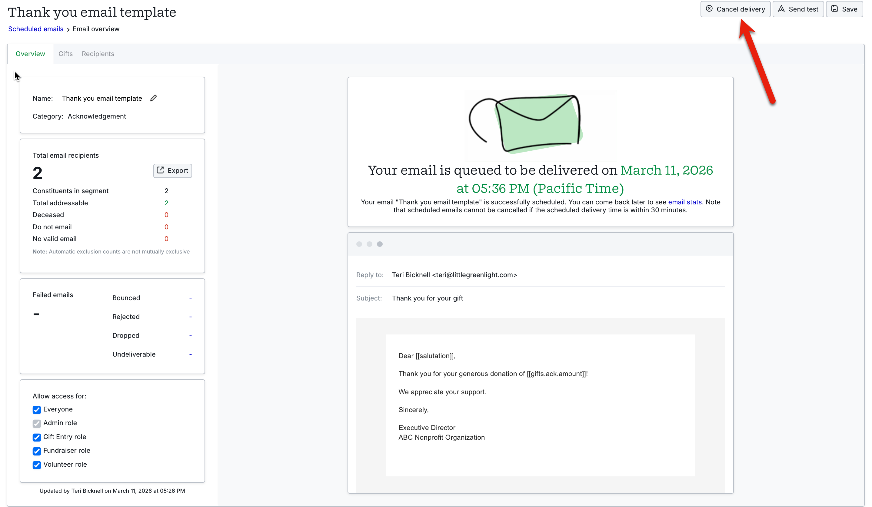 To send your email acknowledgment right away, click the Send immediately button. You'll next need to click a confirmation Send button for the email to be sent. Then you'll see a confirmation that your email will be sent within 30 minutes. (If you clicked "Send" too soon and want to cancel the send process, you can click the Cancel delivery button to stop the email from being sent. But note that you'll need to re-initiate the send process in order for the email acknowledgment to be sent whenever you are ready for it to be sent.)